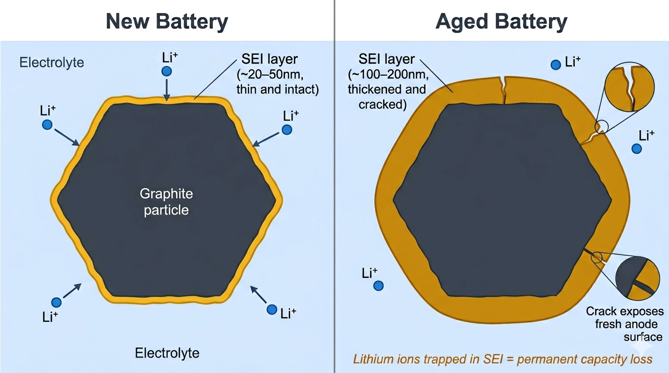 The problem is that the SEI continues to grow slowly throughout the battery's life, consuming lithium ions and electrolyte. Each lithium ion incorporated into the SEI can no longer participate in cycling. This is loss of lithium inventory, a primary cause of capacity fade. The SEI also isn't mechanically robust; it can crack during the volume changes that occur with each charge and discharge cycle, exposing fresh anode surface and triggering more SEI formation.