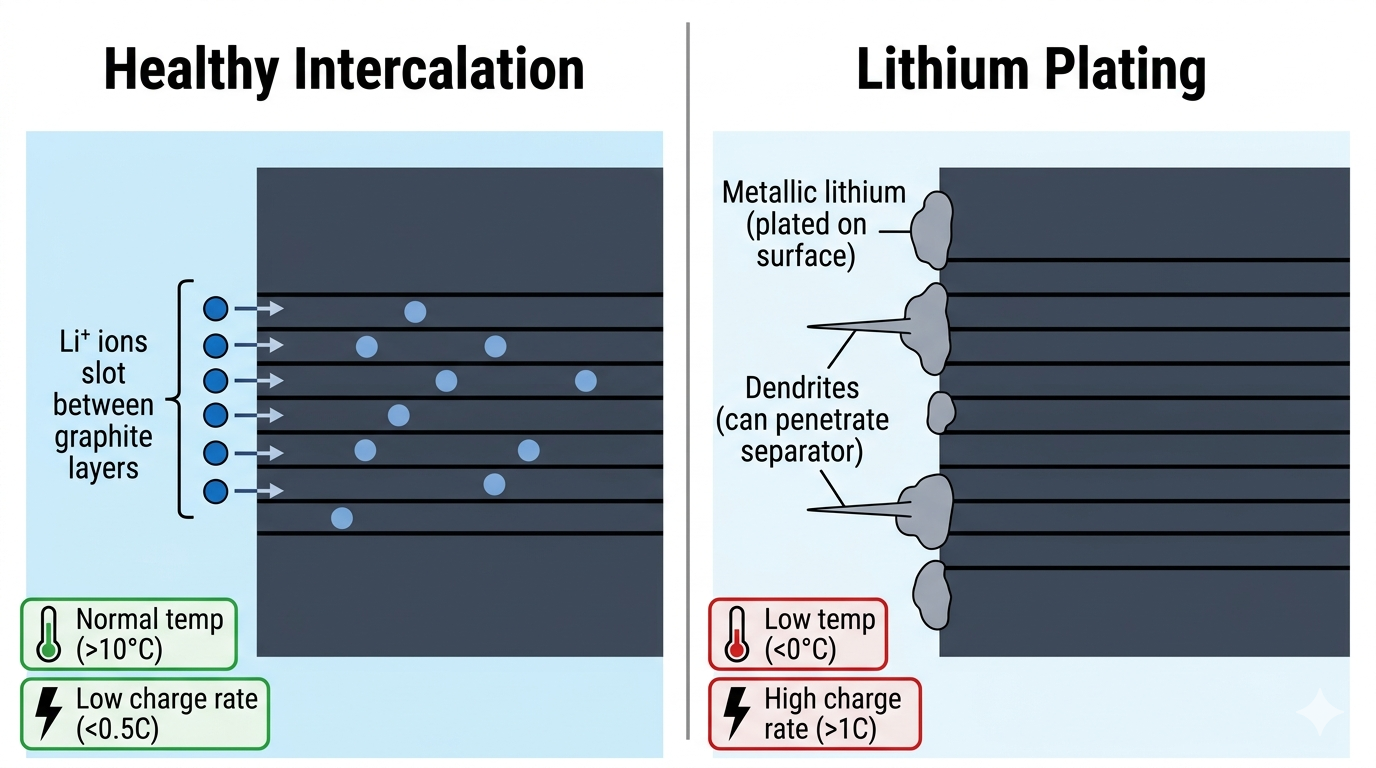 Under certain conditions, lithium ions arriving at the anode during charging cannot intercalate into the graphite quickly enough, and instead deposit as metallic lithium on the surface. This lithium plating is one of the most damaging degradation mechanisms.