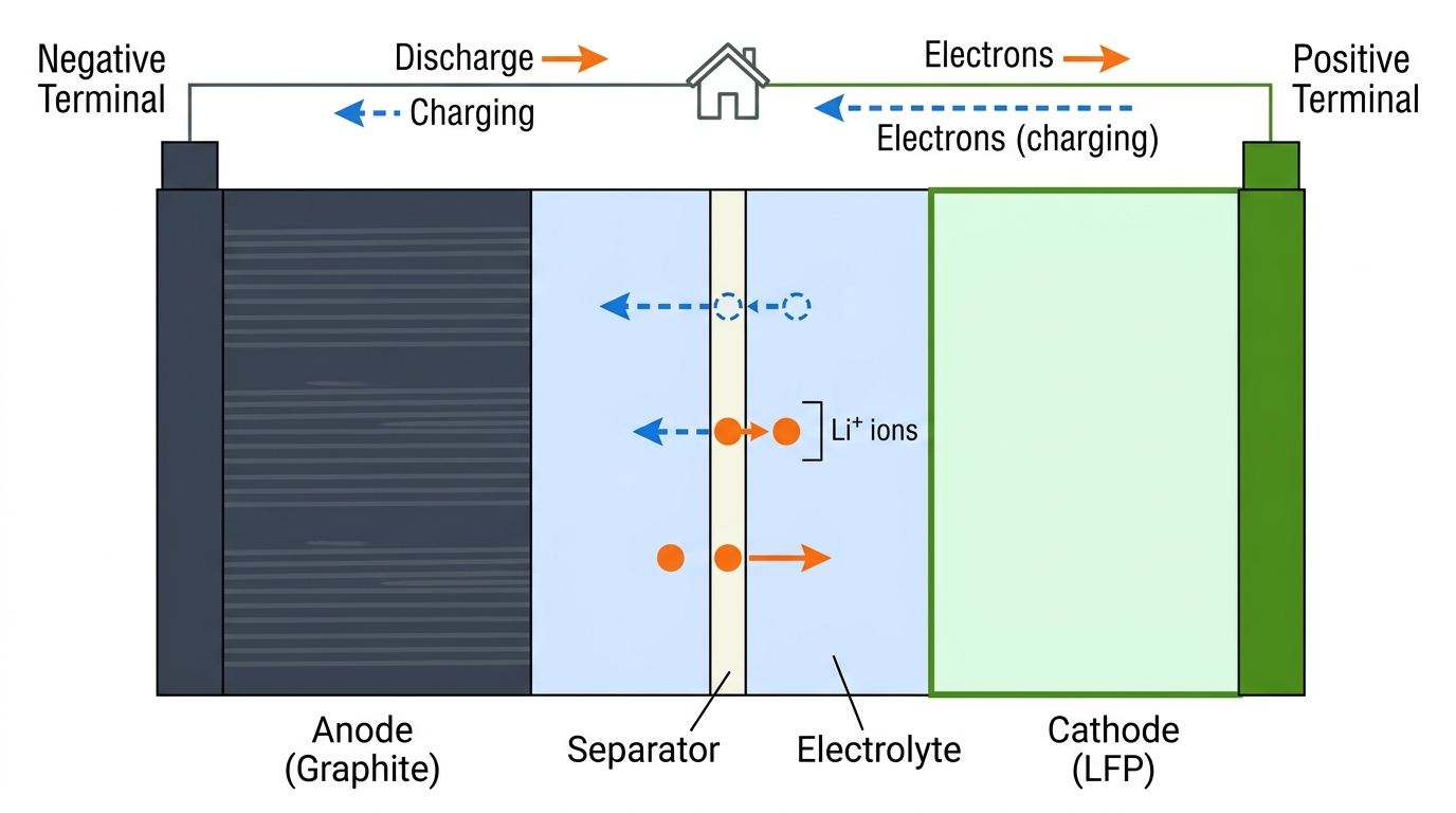 When you charge a battery, lithium ions leave the cathode, travel through the electrolyte, and slot into the layered structure of the graphite anode. When you discharge, the ions make the reverse journey. This process is called intercalation, ions insert themselves into the electrode structure without fundamentally changing it, like sliding books onto a shelf. The electrolyte conducts lithium ions but not electrons, which forces electrons through the external circuit to power your home.