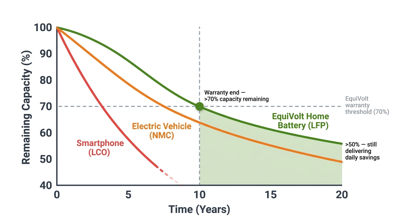 The same underlying technology shows dramatically different longevity depending on chemistry and operating conditions. Home storage represents the ideal combination: the most durable chemistry operating under the gentlest conditions.