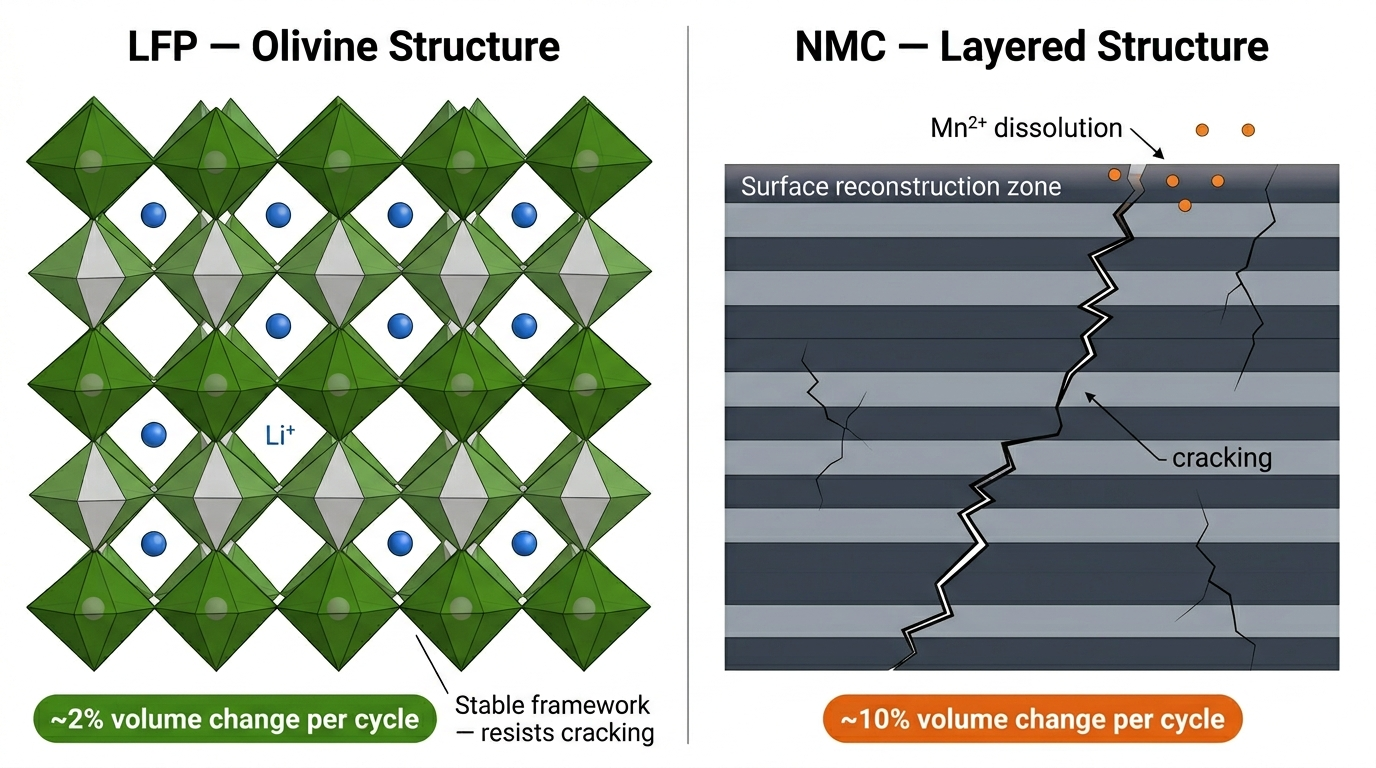 LFP's crystal structure avoids all of these mechanisms. Its ~2% volume change eliminates the particle cracking that plagues layered oxides. Iron dissolution is minimal and the structure remains stable across the entire operating range without phase transitions.