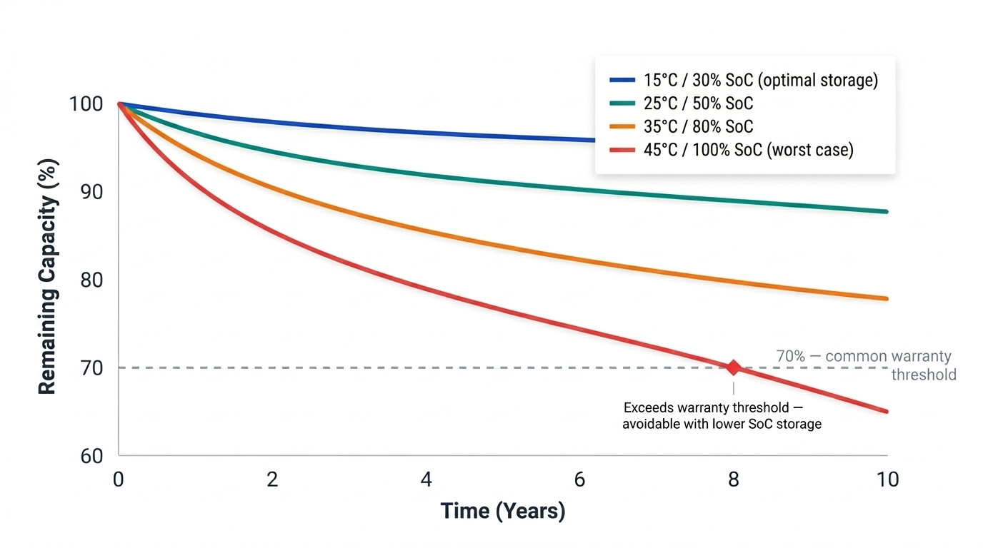 Batteries degrade even when idle. This calendar ageing is driven primarily by continued SEI growth, which proceeds slowly regardless of cycling. The rate depends strongly on temperature and state of charge (SoC): a battery stored hot and fully charged ages much faster than one stored cool at moderate SoC.