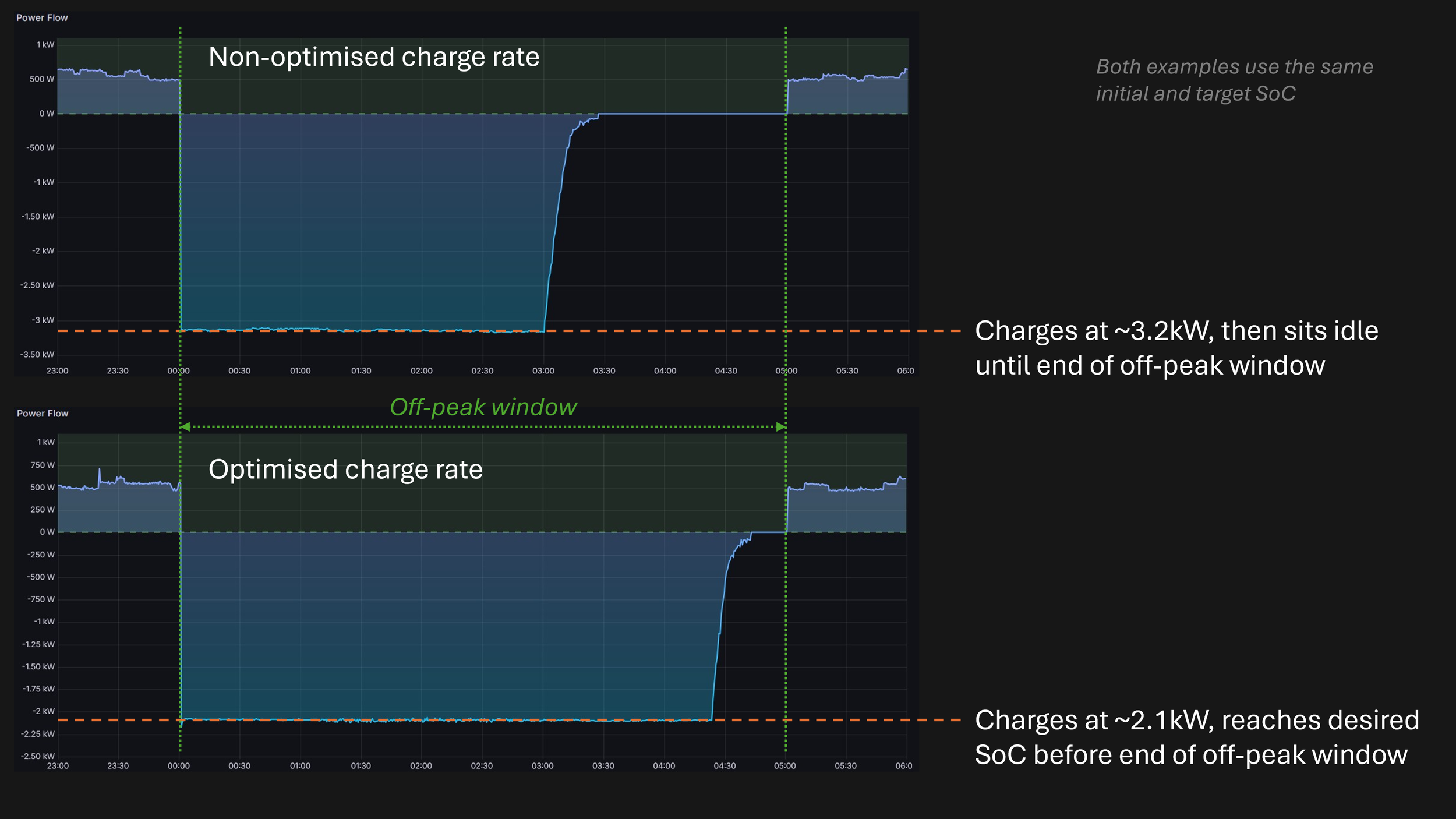 Minimising charge rate while maximising arbitrage. The most straightforward approach to overnight charging would be to charge as fast as possible at the start of the off-peak window. EquiVolt+ takes a different approach: it intelligently spreads charging across the available off-peak period, using the slowest rate consistent with reaching the target state of charge before the window closes. This minimises heat generation and reduces lithium plating risk, meaningfully extending cycle life but without sacrificing any arbitrage value, since the battery still reaches the same charge level by morning.