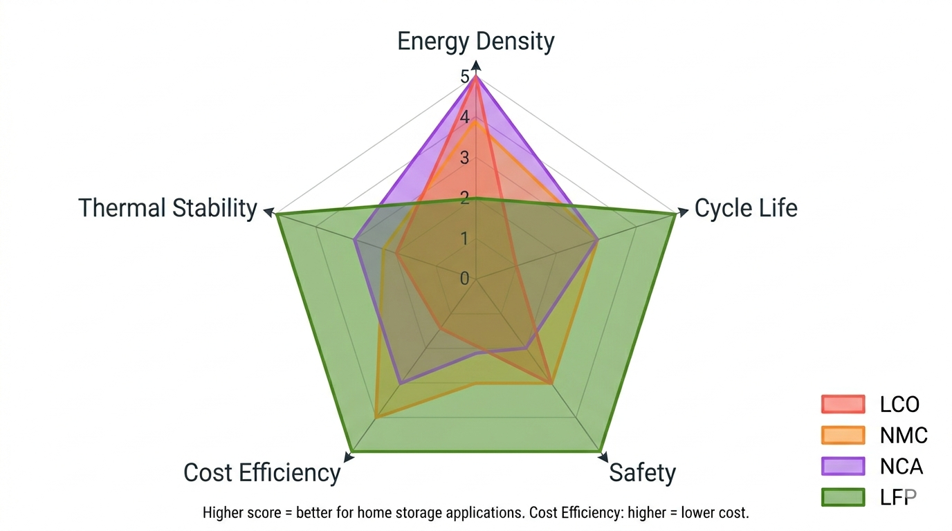 Common in electric vehicles and earlier home batteries. A reasonable balance of energy density and cycle life (1,500 - 3,000 cycles), but requires careful thermal management and contains cobalt.
